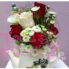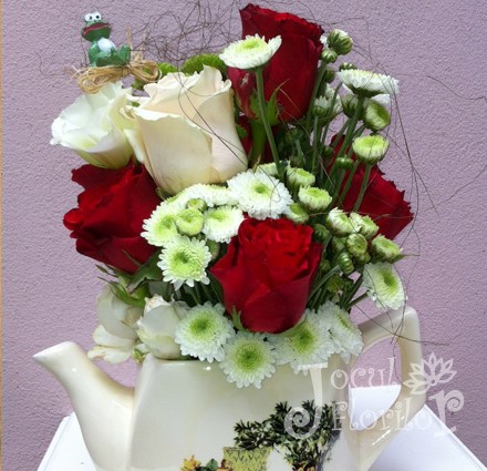 Ceainic cu flori, aranjament floral, trandafiri rosu, trandafiri alb, minicrizanteme