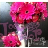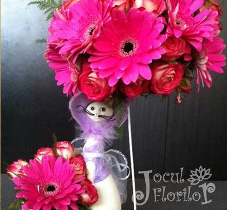 aranjament floral, pisicuta cu flori (suport bijuterii), miniroze fucsia, minijerbera fucsia